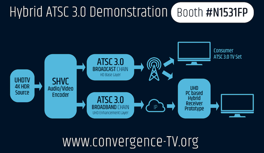At NAB 2018, the Convergence TV Project is demonstrating the delivery of a full UHDTV service using an ATSC 3.0 broadcast path for distributing a regular HD service (2K + HDR) and an ATSC 3.0 broadband path for enhancing the service from HD to UHDTV (4K + HDR).